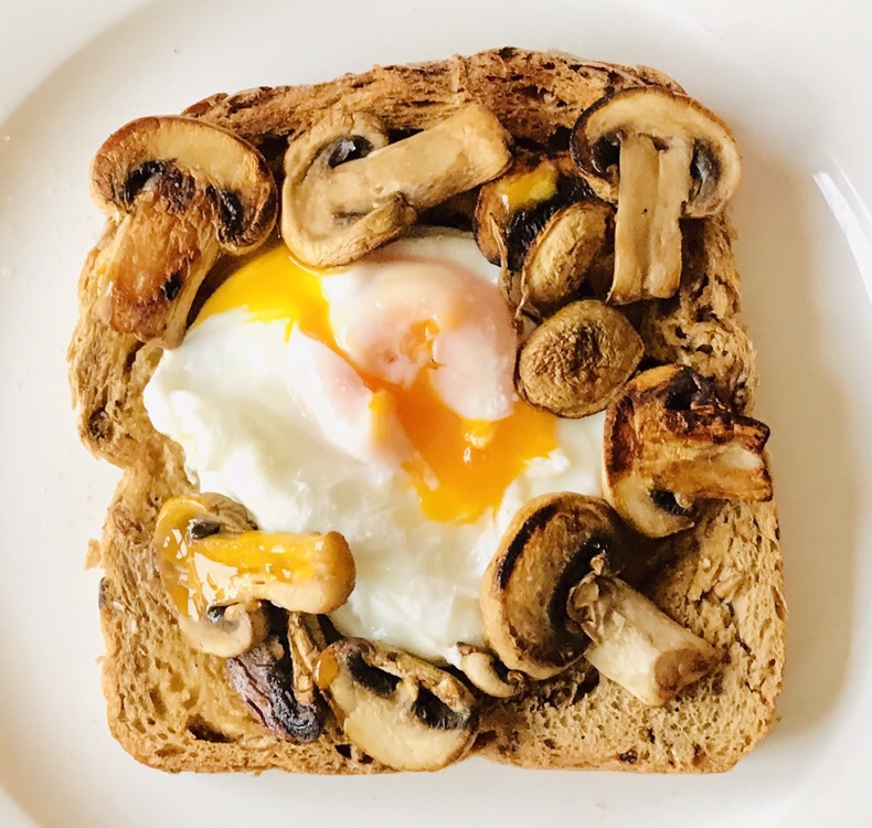 The toast, egg and mushrooms should all be ready at the same time. Butter the toast and season the egg and mushrooms nicely.